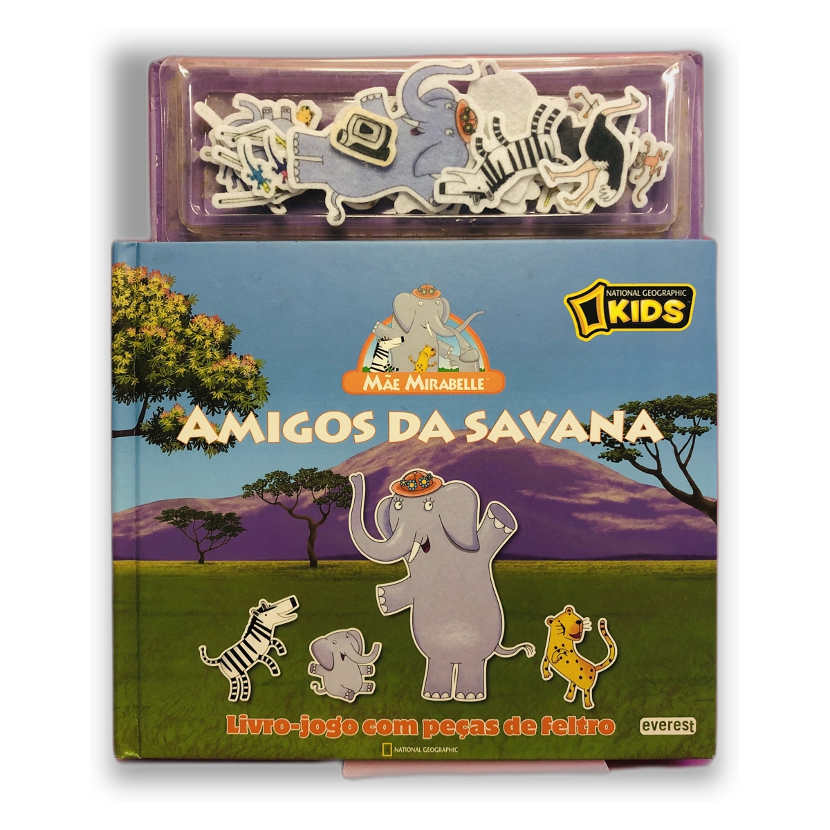 Livro-jogo com peças de feltro, destinado a crianças, que explora a vida na savana através de personagens animais.